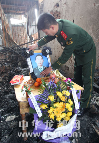 ????正月十五元宵節(jié),人們齊聚在鄭春光犧牲的那間不大的商鋪門前,在那間已經(jīng)被熏黑的墻壁上掛上潔白的小花:“鄭春光你是人民的好兒子”、“春光我們永遠(yuǎn)懷念你!”、“春光一路走好!”字字真情、句句感動,表達(dá)著人們對這位好男兒的無限哀思。人們端來了熱騰騰的湯圓放在鄭春光犧牲的門前,所有的人們面對春光犧牲的地方,為他們心中的英雄深深地鞠了三躬。一位淚流滿面的老人哽咽著:“春光,好孩子,我給你送元宵來了!好孩子,你吃點吧!吃點吧!”在場的人們哭聲一片。