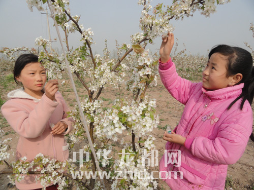 ???????4月12日,商水縣舒莊鄉(xiāng)北王張村的小學(xué)生在自家的梨園為梨花授粉。星期天,該村的小學(xué)生紛紛跑到梨園欣賞盛開的梨花,幫助家長(zhǎng)為梨花授粉,享受著在梨花中勞動(dòng)的樂(lè)趣。