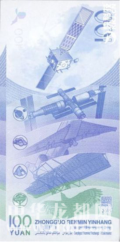 中國(guó)航天紀(jì)念鈔面額為100元,票面長(zhǎng)155毫米,票面寬77毫米,中國(guó)航天紀(jì)念鈔主色調(diào)為藍(lán)色。正面主景圖案為神舟九號(hào)飛船與天宮一號(hào)交會(huì)對(duì)接圖案。左上方為國(guó)徽?qǐng)D案、“中國(guó)人民銀行”行名,其下方為東方紅一號(hào)衛(wèi)星圖案。票面左下方為面額數(shù)字“100”和漢字“壹佰圓”。主景圖案右側(cè)為嫦娥一號(hào)衛(wèi)星圖案,其上方為面額數(shù)字“100”和“中國(guó)航天紀(jì)念”字樣。背面主景圖案由上至下依次為嫦娥一號(hào)衛(wèi)星圖案、2020年中國(guó)空間站“天宮”、噴氣式客機(jī)、馮如2號(hào)雙翼螺旋槳飛機(jī)、飛禽海東青圖案。票面左上角為風(fēng)箏局部圖案,右上角為面額數(shù)字“100”。票面下方為行長(zhǎng)章與年號(hào)“2015”,中國(guó)人民銀行漢語拼音字母和蒙、藏、維、壯四種民族文字的“中國(guó)人民銀行”字樣與面額,面額數(shù)字“100”,漢語拼音字母“YUAN”。