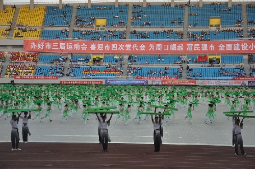 ????大型體育展示表演開始了,《印象周口》氣勢磅礴,來自周口幼兒師范學校和周口科技職業(yè)學院、沈丘縣教體局等單位的演員們披著鮮明的旗幟,激情奔跑在寬闊的體育場上,迎風飄揚的旗幟讓整個會場變成了藍色海洋;周口職業(yè)技術(shù)學院衛(wèi)生學院與周口文昌中學的朗誦表演《荷韻悠長》吟誦豪邁,響徹會場;周口市自行車協(xié)會聯(lián)合川匯區(qū)、淮陽縣、太康縣等多個教體育一起表演的《崛起之路》更是體現(xiàn)了周口正在實現(xiàn)中國夢的征途上迅速崛起,書寫著新的精彩篇章……
