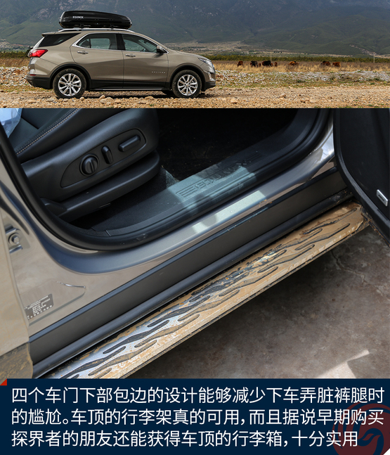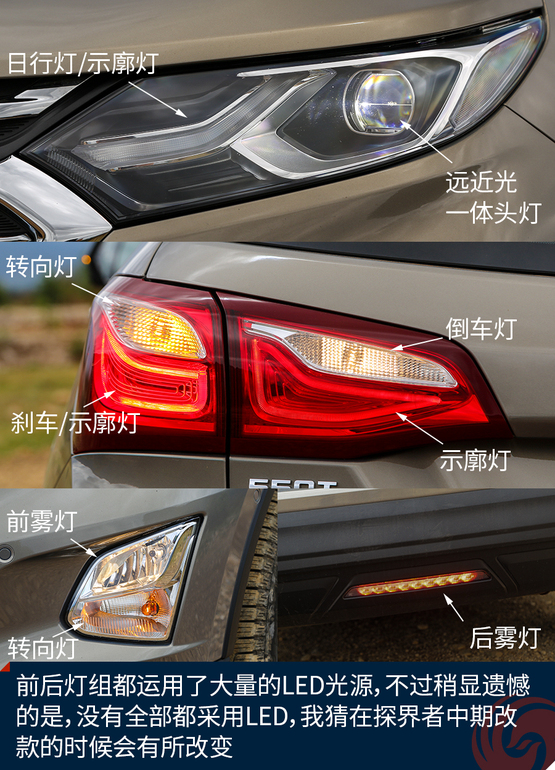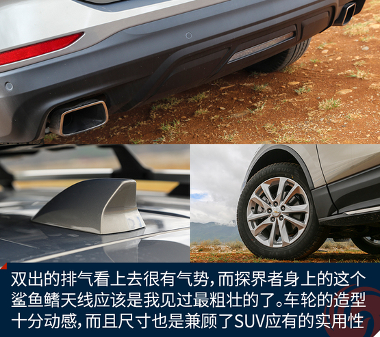 外觀上令我印象深刻的地方有這么幾個,首先前后燈組都運(yùn)用了大量的LED光源,不過稍顯遺憾的是,沒有全部都采用LED,我猜在探界者中期改款的時候會有所改變。四個車門下部包邊的設(shè)計能夠減少下車弄臟褲腿時的尷尬。車頂?shù)男欣罴苷娴目捎?,而且?jù)說早期購買探界者的朋友還能獲得車頂?shù)男欣钕?,十分實用。雙出的排氣看上去很有氣勢,而探界者身上的這個鯊魚鰭天線應(yīng)該是我見過最粗壯的了。車輪的造型十分動感,而且尺寸也是兼顧了SUV應(yīng)有的實用性。