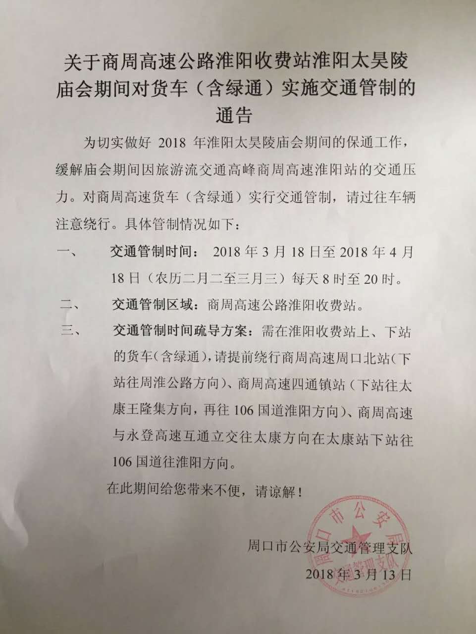 中華龍都網(wǎng)訊(周口報業(yè)全媒體記者 侯俊豫)3月13日,市交警支隊發(fā)布通告稱,為做好2018年太昊陵廟會期間的保通工作,緩解廟會期間商周高速淮陽站的交通壓力。對商周高速貨車(含綠通)實行交通管制,請過往車輛注意繞行?,F(xiàn)對商周高速貨車(含綠通)實行交通管制: