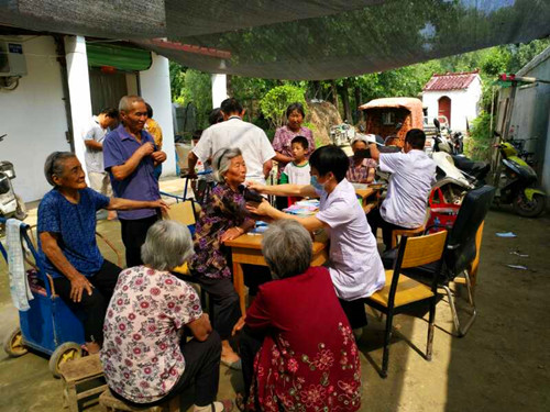 8時(shí)40分許,醫(yī)護(hù)人員在文莊社區(qū)衛(wèi)生室的醫(yī)務(wù)人員的協(xié)助下搭起了臨時(shí)義診臺(tái),為村民測(cè)血糖、量血壓,并針對(duì)測(cè)量結(jié)果給出用藥指導(dǎo),為村民提供健康咨詢服務(wù),現(xiàn)場(chǎng)解答健康問題,并根據(jù)部分村民身體狀況提出合理的防治建議。