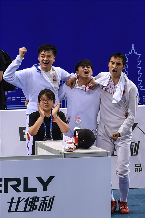 7月25日,在江蘇省無(wú)錫市舉行的2018世界擊劍錦標(biāo)賽男子重劍團(tuán)體賽16進(jìn)8的比賽中,中國(guó)隊(duì)以45∶36戰(zhàn)勝烏克蘭隊(duì),晉級(jí)八強(qiáng)。