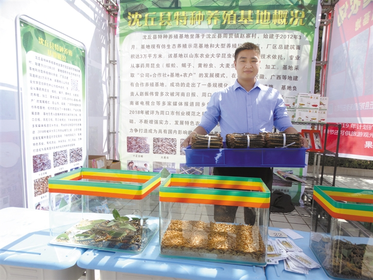 9月22日,沈丘縣舉辦第一個(gè)中國(guó)農(nóng)民豐收節(jié)慶?;顒?dòng),來自全縣22個(gè)鄉(xiāng)鎮(zhèn)(辦事處)的35家農(nóng)民種植、養(yǎng)殖合作社和家庭農(nóng)場(chǎng),展示了槐山藥、黃金梨、冬棗、木瓜、“袖珍”黃瓜、活體蜈蚣、蝎子等120余個(gè)品種。