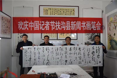 筆墨寫春秋,重彩頌佳節(jié)。為慶祝第19個中國記者節(jié),在扶溝縣的張坡詩詞名人書畫館,來自省書法家協(xié)會的書法家與當(dāng)?shù)匦侣勑麄鞑块T的書畫愛好者們齊聚一堂,以舉行書畫筆會的形式向新聞媒體人慶賀節(jié)日。