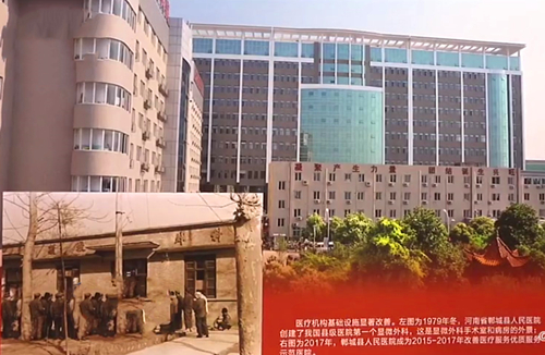 河南電視臺記者陳貞君在展覽板前介紹,這里是位于第四展區(qū)的兩幅同一所醫(yī)院的照片——河南省鄲城縣人民醫(yī)院,這張是1979年冬天,鄲城縣人民醫(yī)院創(chuàng)建了我國縣級醫(yī)院第一個顯微外科,這就是當(dāng)時的顯微外科的手術(shù)室和病房的外景,這張是2017年的鄲城縣人民醫(yī)院。可以說改革開放讓同一所醫(yī)院有了滄海桑田般的變遷。