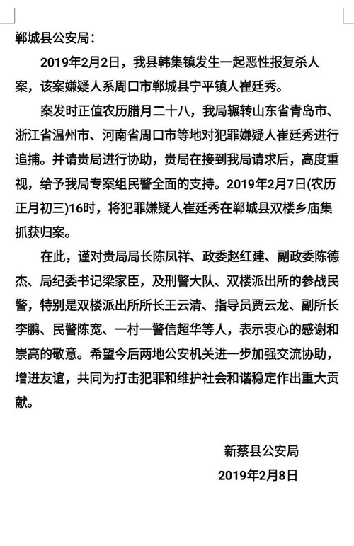 至此,駐馬店新蔡縣“2019.2.2”重大刑事案件全面告破。目前,嫌犯已由鄲城警方移交給新蔡警方做進一步偵查辦理。