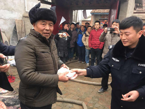 2月17日下午3時(shí)許,鄲城縣南豐鎮(zhèn)徐寨行政村徐大莊一村民使用地鍋后忘記滅火發(fā)生火災(zāi),鄲城縣公安局一村一警張振偉冒險(xiǎn)進(jìn)入火中,幫助轉(zhuǎn)移出1萬元現(xiàn)金和重要證件。