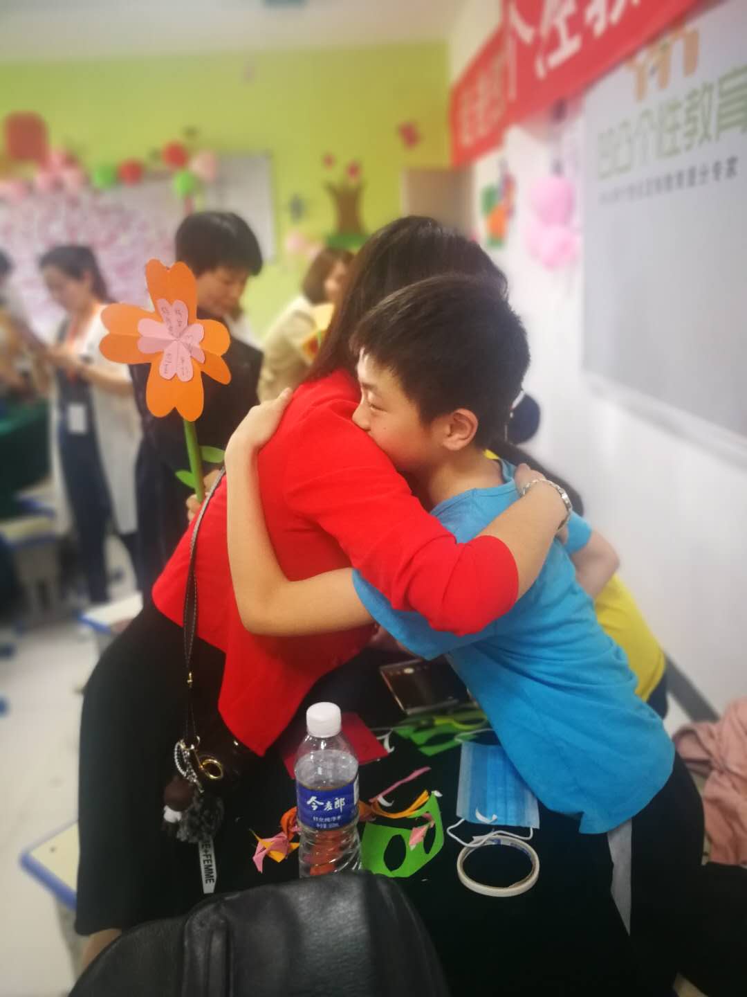活動(dòng)上,在專(zhuān)業(yè)手工教師的指導(dǎo)以及媽媽的配合下,這些小記者自己動(dòng)手利用剪刀、雙面膠、彩紙等學(xué)習(xí)制做康乃馨紙花。五層紅色的花瓣、兩片綠葉、一根花枝,經(jīng)過(guò)近一個(gè)小時(shí)的反復(fù)實(shí)踐,一朵朵紙花陸續(xù)制好,成功的喜悅映紅了孩子們的笑臉。在祝??ㄆ蠈?xiě)下對(duì)媽媽的祝福語(yǔ)后,孩子們手捧用彩紙包裝好的紙花,拿著祝??ㄋ偷侥赣H手中,和媽媽熱情擁抱、向媽媽表達(dá)愛(ài)的祝福。