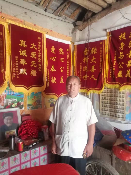 張同生今年65歲,發(fā)揚(yáng)雷鋒精神,處處奉獻(xiàn)愛(ài)心,自愿參加河南省紅十字會(huì)志愿者,建立救病扶困基金,為困難病人墊付醫(yī)療費(fèi),幫助病人聯(lián)系醫(yī)院、專家教授治病,辦理住院手續(xù),為病人干的好事實(shí)事,就像秋后熟透的葡萄—一串一串的。病人為他送的錦旗掛滿了3間堂屋,病人為他送的表?yè)P(yáng)信少說(shuō)也有半尺厚。