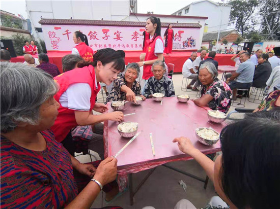 與此同時(shí),在演出現(xiàn)場附近的村委大院內(nèi),由周口市慈孝文化促進(jìn)會、北斗達(dá)教育集團(tuán)等組成的200多名志愿團(tuán)隊(duì)正忙得不亦樂乎,調(diào)餡、包餃子、下鍋、端盤,兩個(gè)多小時(shí)內(nèi),他們精心包出20000多個(gè)愛心水餃。11時(shí)30分,餃子宴正式開始,老人們一邊吃著水餃一邊觀看者演出,喜笑顏開,呈現(xiàn)出一片相親相敬的溫馨畫面。