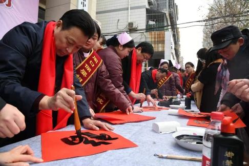 18日上午9時(shí)30分,位于新建街的周口儷嬰婦女兒童醫(yī)院門前喜氣洋洋,張燈結(jié)彩,熱鬧非凡,儷嬰婦女兒童醫(yī)院邀請(qǐng)市書(shū)協(xié)、川匯區(qū)書(shū)協(xié)的書(shū)法家們,在門前為“送福送健康暨書(shū)法家義寫(xiě)春聯(lián)”活動(dòng)舉行了簡(jiǎn)短的儀式,隨即活動(dòng)展開(kāi),一邊是儷嬰婦女兒童醫(yī)院的專家們將坐診臺(tái)搬到門前,細(xì)致地為來(lái)往的居民免費(fèi)量血壓、把脈等義診,一邊擺下10多張桌子和筆墨紙硯,中國(guó)書(shū)協(xié)會(huì)員游保峰,著名書(shū)法家、川匯區(qū)書(shū)協(xié)終身名譽(yù)主席李大慶,書(shū)法家馮干敏、李輝、李國(guó)斌及川匯區(qū)書(shū)協(xié)主席李尊杰,市書(shū)協(xié)副主席劉廣巖,川匯區(qū)書(shū)協(xié)副主席兼秘書(shū)長(zhǎng)杜忠義,副主席曾祥峰、何楠,著名書(shū)法家寇成義等書(shū)法家們,展開(kāi)大紅的紙張,揮毫潑墨,飄著墨香的福字和一對(duì)對(duì)大紅的春聯(lián),帶著新春的祝福,送到居民手里,一波波居民到自己喜愛(ài)的書(shū)法家面前,喜討福字和春聯(lián),開(kāi)心的喜悅洋溢著臉上……