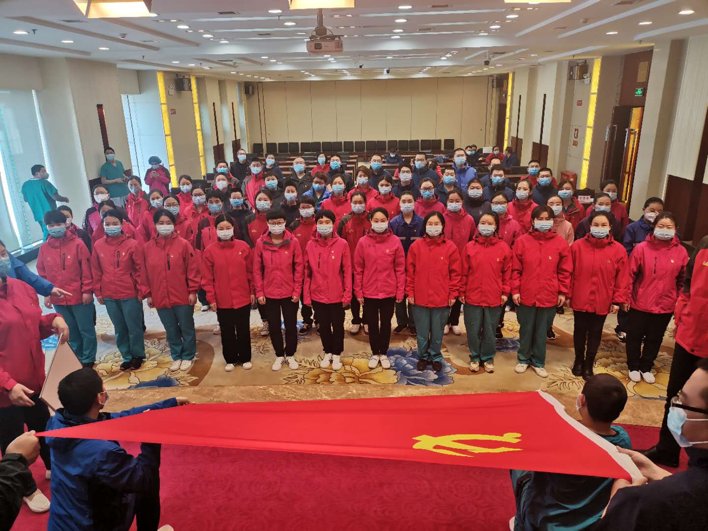 3月19日,周口援鄂醫(yī)療隊周口市中心醫(yī)院祁文麗、徐貴琴、解玉東、王亞麗、王玉才、王冰清6名隊員,站在鮮紅的黨旗面前莊嚴(yán)宣誓志愿加入中國共產(chǎn)黨。