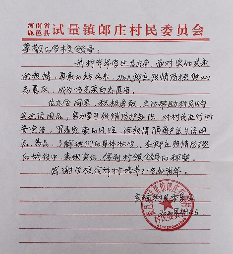 “龍九合同學(xué)積極勇敢,主動幫村民購買生活用品,努力學(xué)習(xí)疫情防護(hù)知識,對村民進(jìn)行科普宣傳,冒著感染的風(fēng)險給疫情隔離戶送生活用品、藥品,在我村疫情防控的戰(zhàn)役中表現(xiàn)突出,得到村鎮(zhèn)領(lǐng)導(dǎo)的稱贊,感謝學(xué)校給我們培養(yǎng)了一名好青年……”這是一封要寄往周口師范學(xué)院的感謝信,落款為鹿邑縣試量鎮(zhèn)郎莊行政村村民委員會。