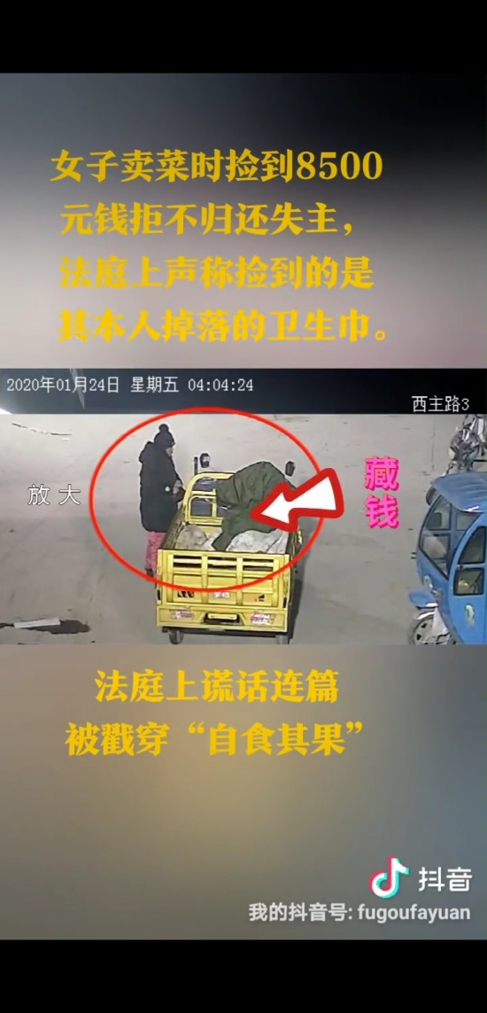 庭審中,面對監(jiān)控錄像顯示楊某彎腰撿拾錢款的畫面,楊某本人百般抵賴、謊話連篇,拒不承認撿到錢款。當法官詢問楊某如何解釋監(jiān)控畫面中顯示其撿到了白色包裹時,楊某居然說是彎腰撿東西了,但撿的不是錢,撿的是她自己的衛(wèi)生巾。法官再次向楊某告知當事人作虛假陳述的后果及應(yīng)當承擔的法律責任,楊某仍一口咬定撿到的不是錢,撿的是衛(wèi)生巾。法官遂傳喚現(xiàn)場目擊證人出庭作證,兩名證人依法進行了法庭宣誓,明確表示見到了楊某撿起地上一包錢并放入其本人包中的行為。此時,原告又提交了一份錄音證據(jù),法官予以當庭播放。錄音清晰顯示,楊某在電話中曾經(jīng)承認1月24日早上撿到錢款的行為。