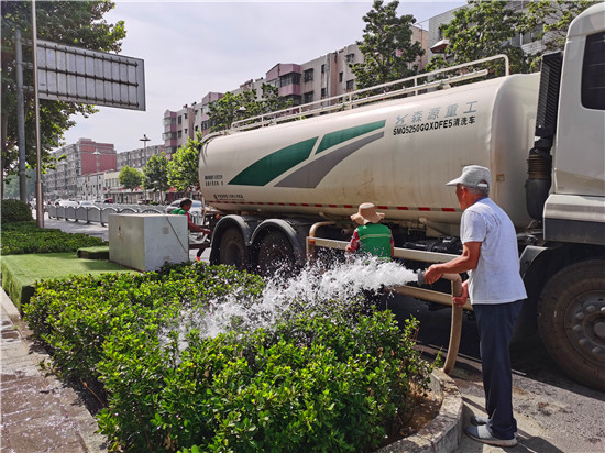 6月4日,園林工人在市區(qū)七一路為綠化帶內(nèi)植被澆水“解渴”。近期我市持續(xù)高溫天氣,為應(yīng)對(duì)連續(xù)高溫,綠化部門加大對(duì)綠化樹木的澆灌灑水頻次,為城區(qū)的花草樹木“消暑”, 確保綠化植物的存活率。