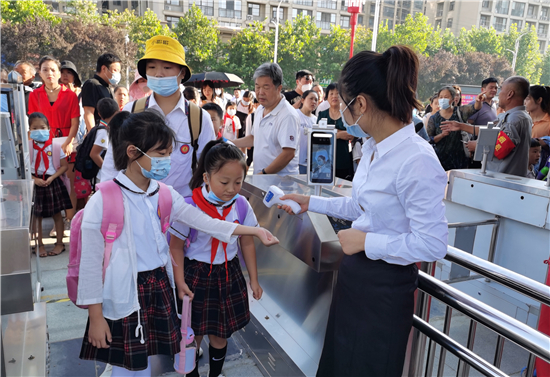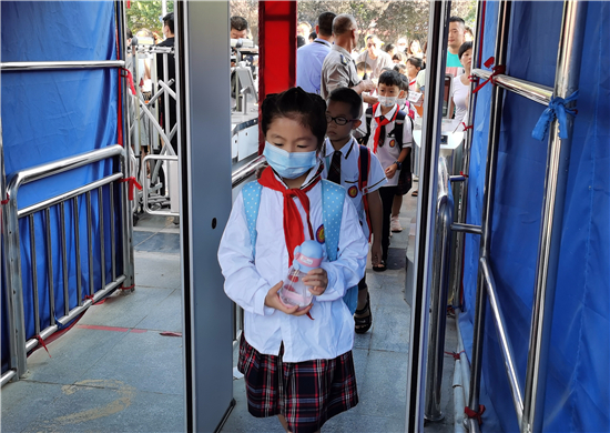 9月7日早上,周口市文昌小學(xué)的學(xué)生有序排隊(duì)測量體溫后進(jìn)入學(xué)校。據(jù)文昌小學(xué)校長介紹,全市中小學(xué)實(shí)行錯峰開學(xué)。今天是小學(xué)開學(xué)時間,文昌小學(xué)學(xué)生每個年級實(shí)行錯時上下學(xué),學(xué)生入校要測體溫,并為一年級新生舉辦了主題為“夢從這里啟航”的“迎新儀式”。