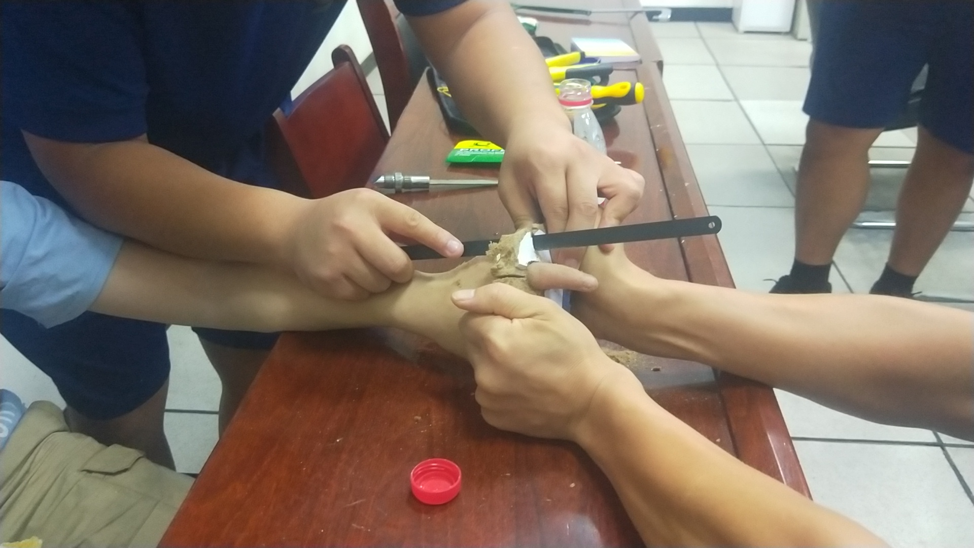 看到救援人員,小男孩十分害羞,有點(diǎn)不好意思。“我看桌子上有個孔,就是想看看手指能不能伸進(jìn)去,結(jié)果就拔不出來了?!本仍藛T經(jīng)觀察發(fā)現(xiàn),小男孩左手無名指被卡在課桌木板上的小孔里,木板已被裁下,木板材質(zhì)為鋸末壓縮板,此時小男孩手指被卡部位周圍已發(fā)生腫脹必須馬上處理。救援人員利用鋼鋸將木板一點(diǎn)點(diǎn)鋸開,然后又用鉗子用力將木板夾開,經(jīng)過3分鐘救援,成功將禁錮小男孩手指的木板摘除??吹侥景灞粡氖稚先∠?,男孩長長地舒了口氣。