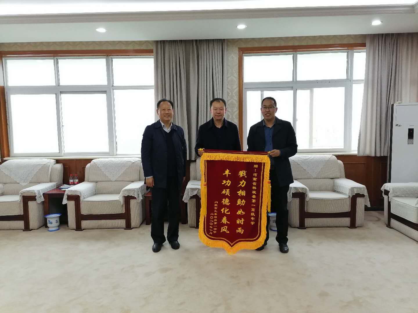 近日,內(nèi)蒙古自治區(qū)通遼市扎魯特旗第一中學(xué)校長劉思超為感謝鄲城一高,特意從1700多公里外趕來,贈送一面“豐功碩德化春風(fēng) 戮力相助如時(shí)雨”錦旗。鄲城縣政府督學(xué)王平崇參加贈送儀式。