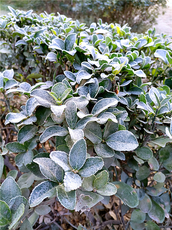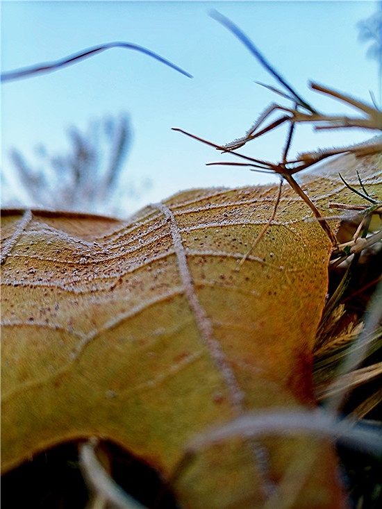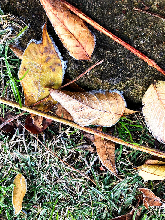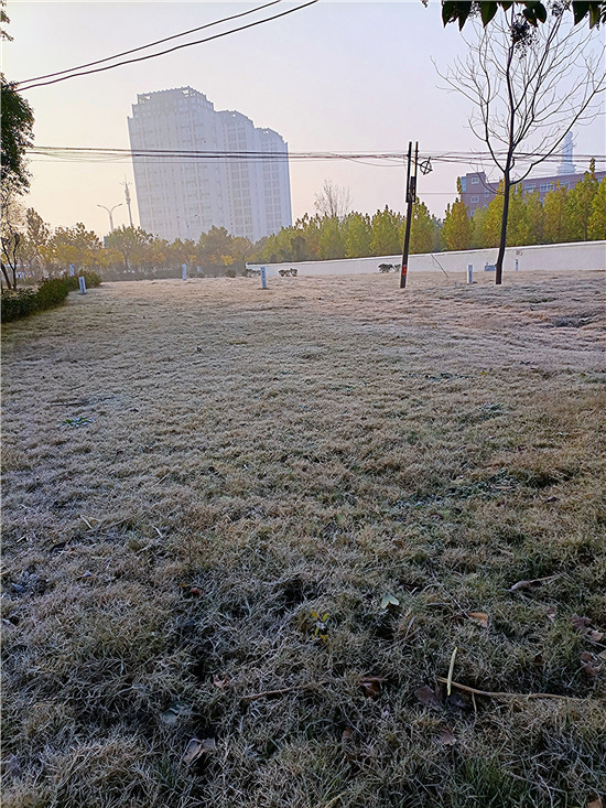 百草今何妝?茫茫著華霜。寒煙鎖素艷,疾步量路長(zhǎng)。12月4日早晨,我市下霜了,潔白的華霜就像一層薄紗,在陽(yáng)光的映照下分外美麗。