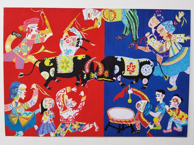 2020年4月,錢玉燕無意中看到“決勝全面小康”第二屆全國農(nóng)民畫展覽征稿啟事,對(duì)農(nóng)村生活非常熟悉的她決定一試。她立足于周口平原農(nóng)區(qū)的特色,深深領(lǐng)悟周口幾千年來的農(nóng)耕文化,對(duì)參賽作品進(jìn)行了認(rèn)真、系統(tǒng)地構(gòu)思,最終決定以歡慶豐收的斗?;顒?dòng)為題材,把農(nóng)耕文化的深遠(yuǎn)、厚重與豐富的藝術(shù)表現(xiàn)手法相融合。她采用普通的繪畫卡紙,運(yùn)用多種繪畫顏料,充分借鑒漢畫藝術(shù),吸收中原地區(qū)的剪紙文化、西方藝術(shù)大師畢加索立體畫派的藝術(shù)風(fēng)格和古埃及畫的靈感,以艷麗的紅、藍(lán)為主背景,采取夸張的表現(xiàn)手法,把斗牛的場(chǎng)景表現(xiàn)得淋漓盡致。作品創(chuàng)作發(fā)揮了豐富的想象力,人物動(dòng)物造型借鑒中國民間藝術(shù)剪紙的方式表現(xiàn),以大膽、夸張、強(qiáng)烈的色彩搭配,把無限深廣的空間“壓扁”到一個(gè)平面上。