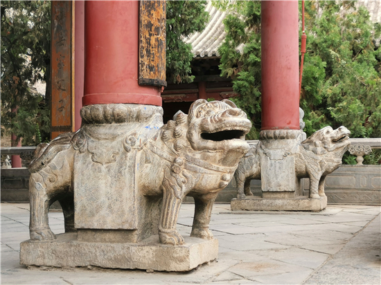 過山門,突現(xiàn)在眼前的是一對(duì)鐵旗桿。鐵旗桿高22米、重3萬余斤,且桿身鑄有銘文圖案、山水花卉、龍鳳鳥獸。