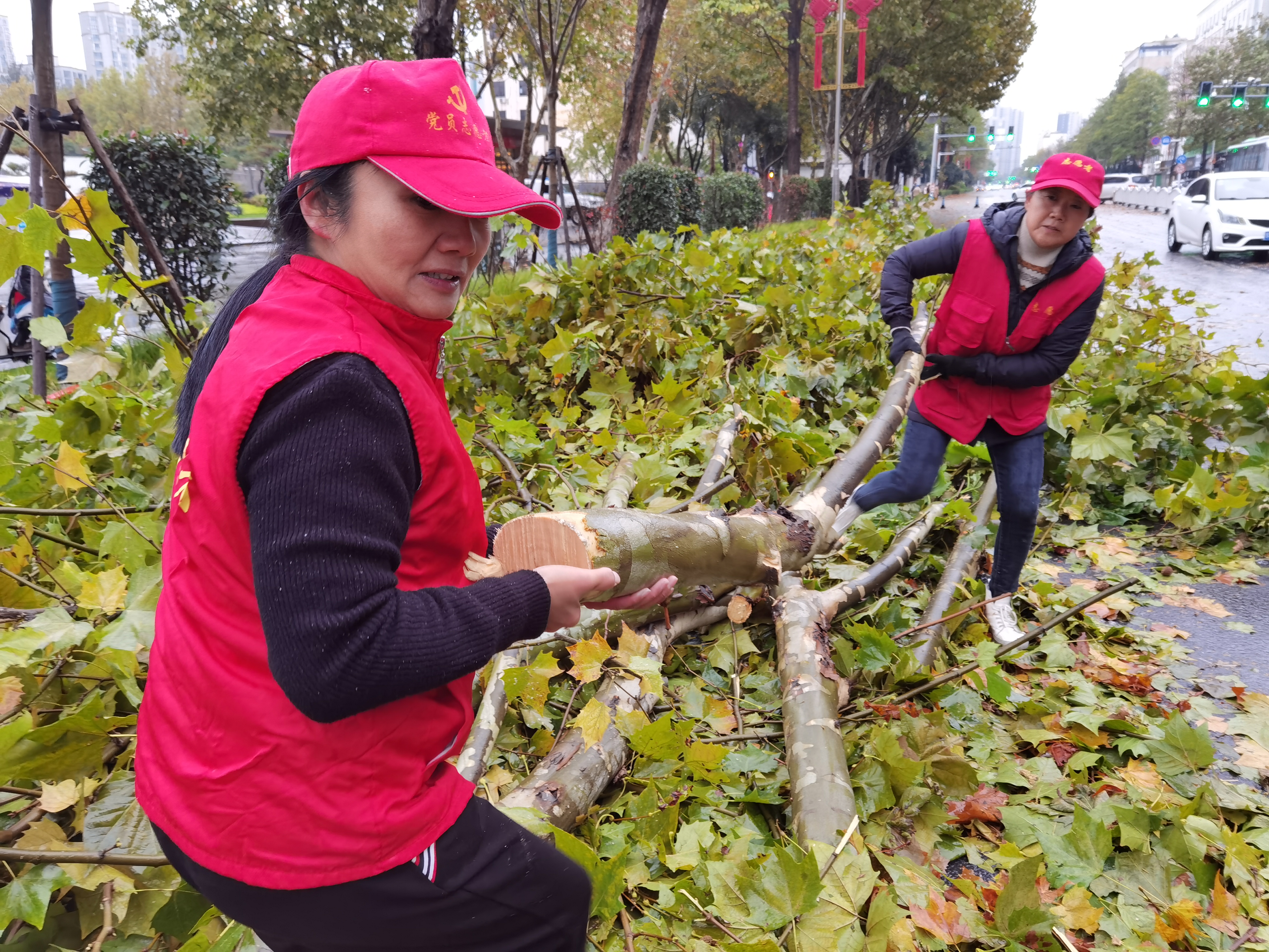 志愿者抬起被鋸斷的樹枝搬上車