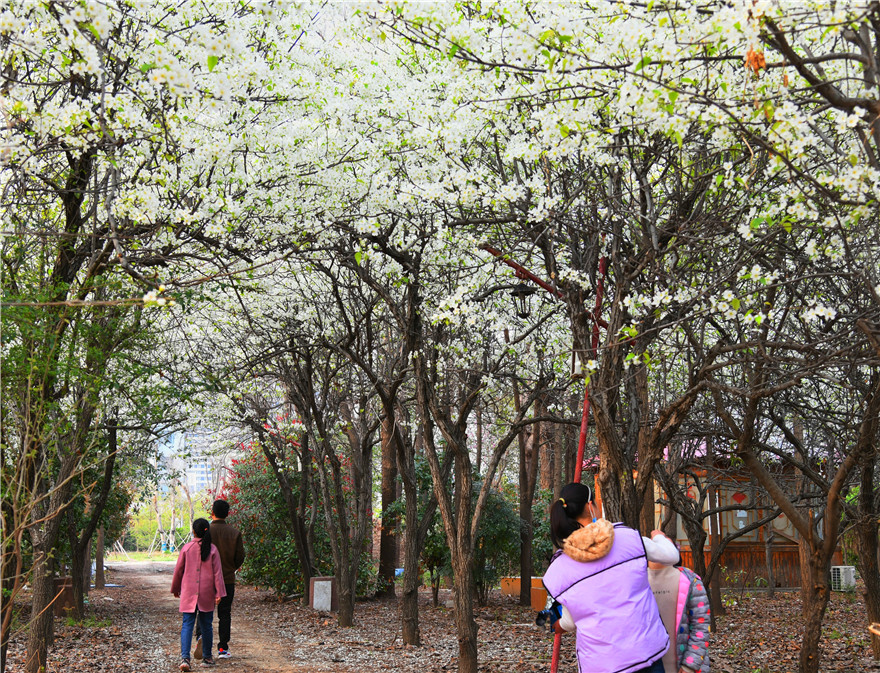 3月26日,周口市天氣晴好,植物園內(nèi)岸柳青青、鶯飛草長(zhǎng)。園內(nèi)的梨花正是盛開時(shí),不少市民在此駐足觀賞拍照。②8