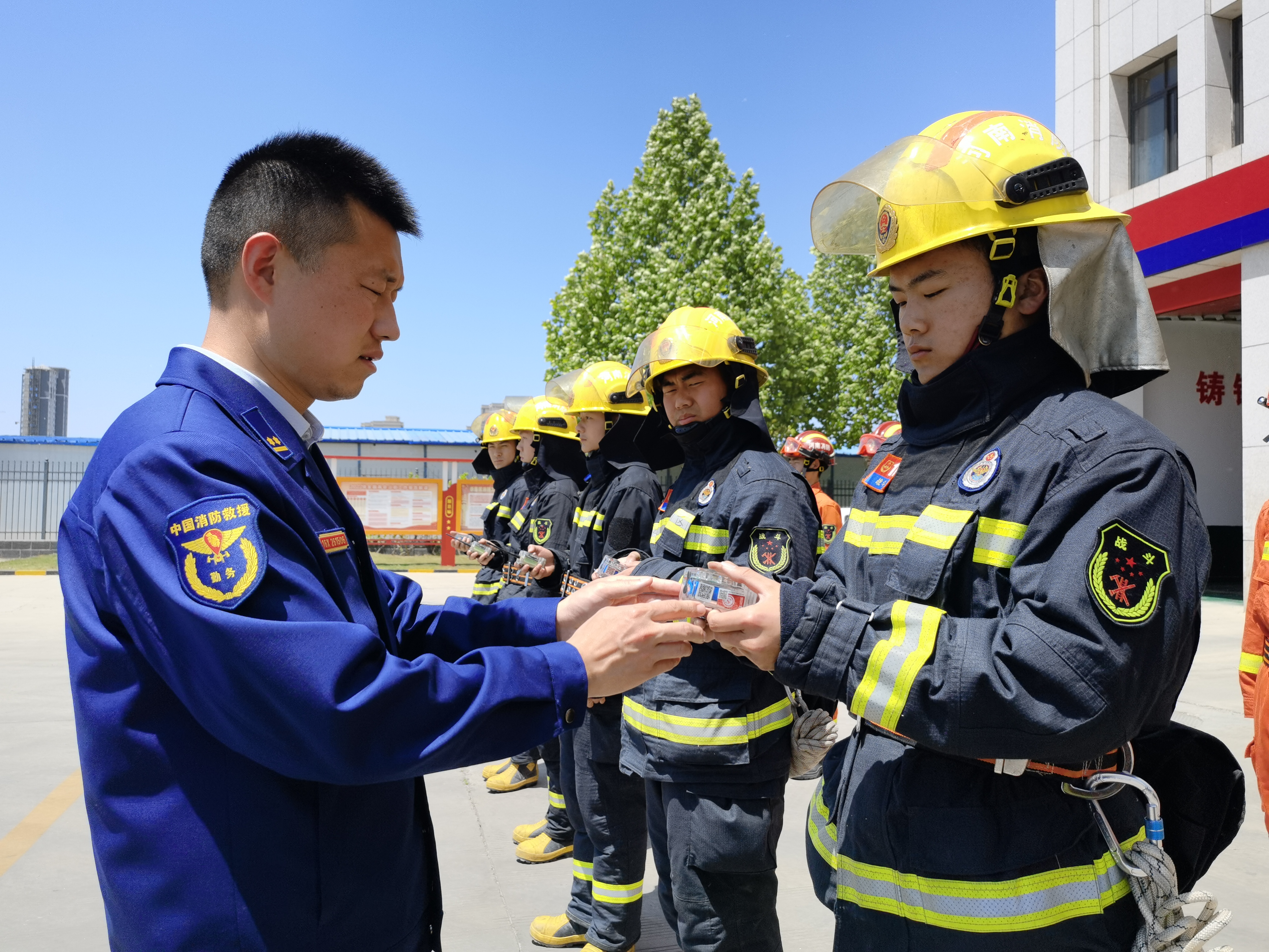 “向右看齊,向前看,向右轉(zhuǎn),跑步走……”烈日當空,室外溫度30℃,在示范區(qū)消防救援大隊門前廣場,身穿火焰藍的欒慶帥正帶著一群年輕的消防指戰(zhàn)員進行日常訓練?!熬殲閼?zhàn)!只有擁有堅定的信念和過硬的本領,才能救民于水火,助民于危難,奮戰(zhàn)在人民群眾最需要的地方。”欒慶帥說。