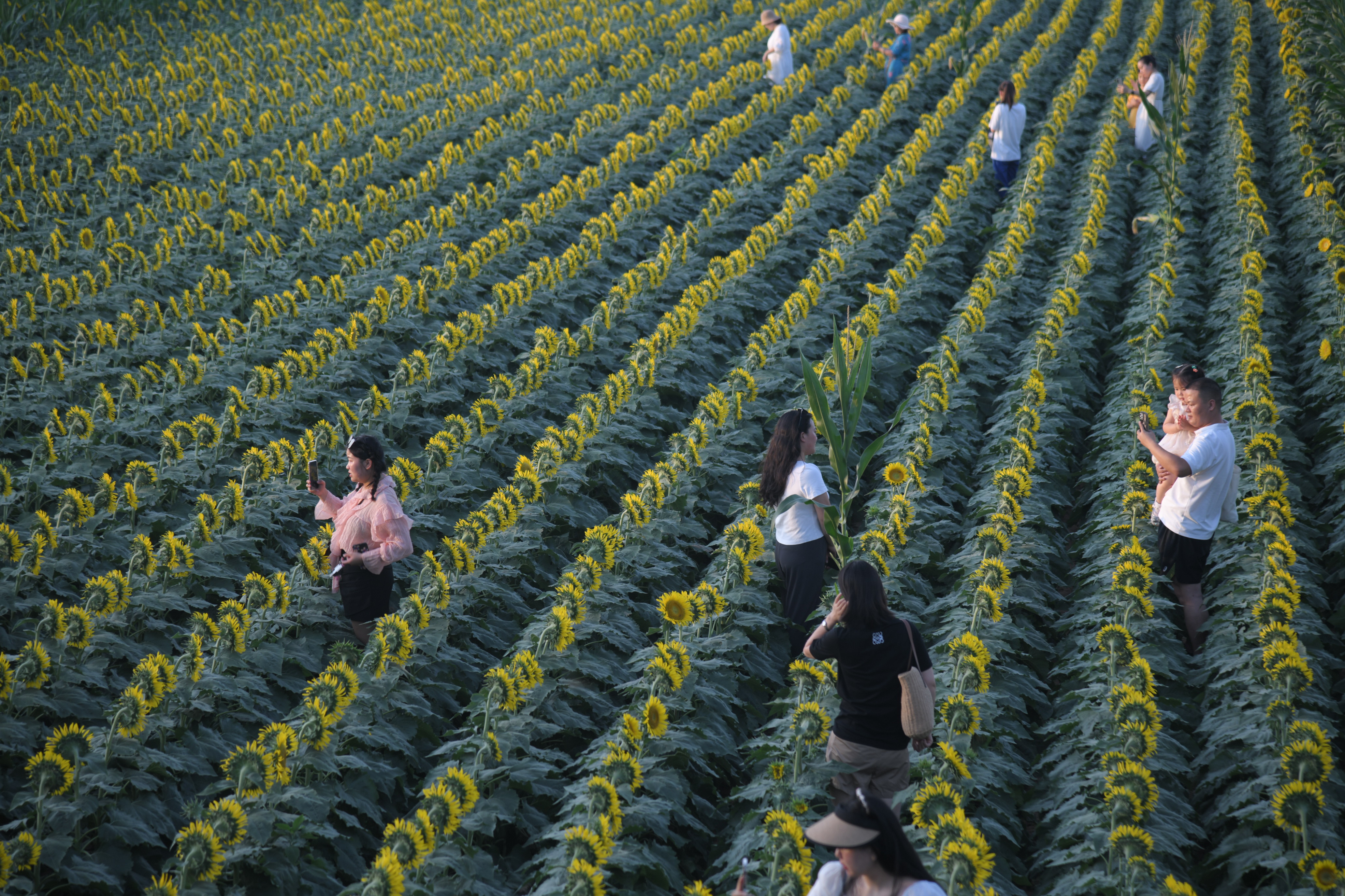 近年來,我市以創(chuàng)建全國文明城市為引領,加快推進沙潁河生態(tài)經(jīng)濟帶全域文旅項目建設,提升沿河綠化景觀效果,給市民增加游玩好去處。圖為昨日市民在沙潁河南岸武盛大道東側(cè)的千畝向日葵花海游玩。記者付永奇攝 ②15
