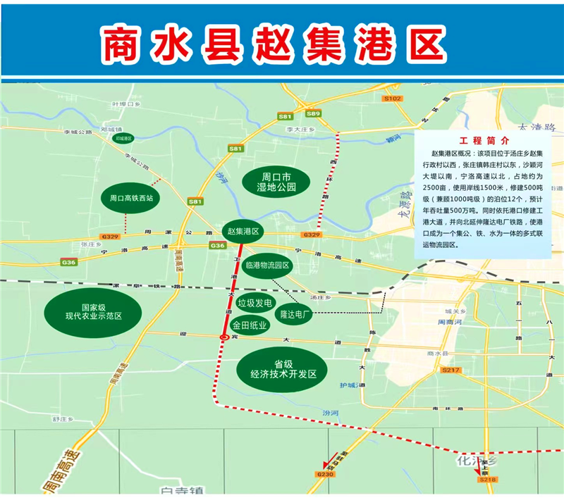 2017年,商水縣政府按照前瞻30年、謀劃15年、做實(shí)近5年工作要求,開始規(guī)劃修建位于湯莊鄉(xiāng)趙集行政村以西,張莊鎮(zhèn)韓莊村以東,沙潁河大堤以南,寧洛高速以北的趙集作業(yè)區(qū)。規(guī)劃建設(shè)占地約720畝、總投資6.37億元的趙集港項(xiàng)目,同時(shí)修建12個(gè)1000噸級(jí)泊位,其中散貨泊位8個(gè),通用泊位2個(gè),多用途泊位2個(gè),占用岸線1250米,預(yù)計(jì)年吞吐量達(dá)475萬(wàn)噸。碼頭采用順岸式布置,結(jié)構(gòu)采用重力式扶壁結(jié)構(gòu),前沿配置30噸門座式固定吊裝卸作業(yè)。港口涵蓋貨物拆解區(qū)、散件堆放區(qū)等4個(gè)功能區(qū),集裝箱露天堆場(chǎng)、大型貨車停車場(chǎng)等5個(gè)場(chǎng)地。圍繞趙集港,高標(biāo)準(zhǔn)規(guī)劃建設(shè)占地約6.2平方公里的多式聯(lián)運(yùn)臨港經(jīng)濟(jì)園區(qū),下設(shè)金田紙業(yè)、建材倉(cāng)儲(chǔ)兩個(gè)物流園區(qū),涵蓋建材及建材制品園區(qū)、造紙業(yè)原料及成品園區(qū)、紡織服裝原料及成品園區(qū)3個(gè)功能園區(qū)。該項(xiàng)目建成投入使用后,不但能加快商水縣紡織園區(qū)、循環(huán)園區(qū)、經(jīng)濟(jì)開發(fā)區(qū)、隆達(dá)電廠等企業(yè)物質(zhì)的流轉(zhuǎn),而且能使商水港成為周口沙潁河重要的鐵運(yùn)、陸運(yùn)、水運(yùn)交通樞紐、貨物貿(mào)易和物流中轉(zhuǎn)聚集區(qū),從而進(jìn)一步促進(jìn)商水經(jīng)濟(jì)的健康、快速發(fā)展。