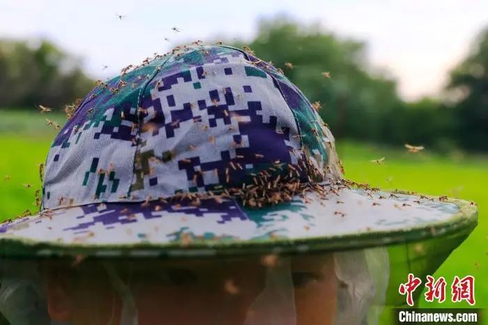 資料圖:防蚊帽上落滿了蚊蟲。徐明遠(yuǎn) 攝