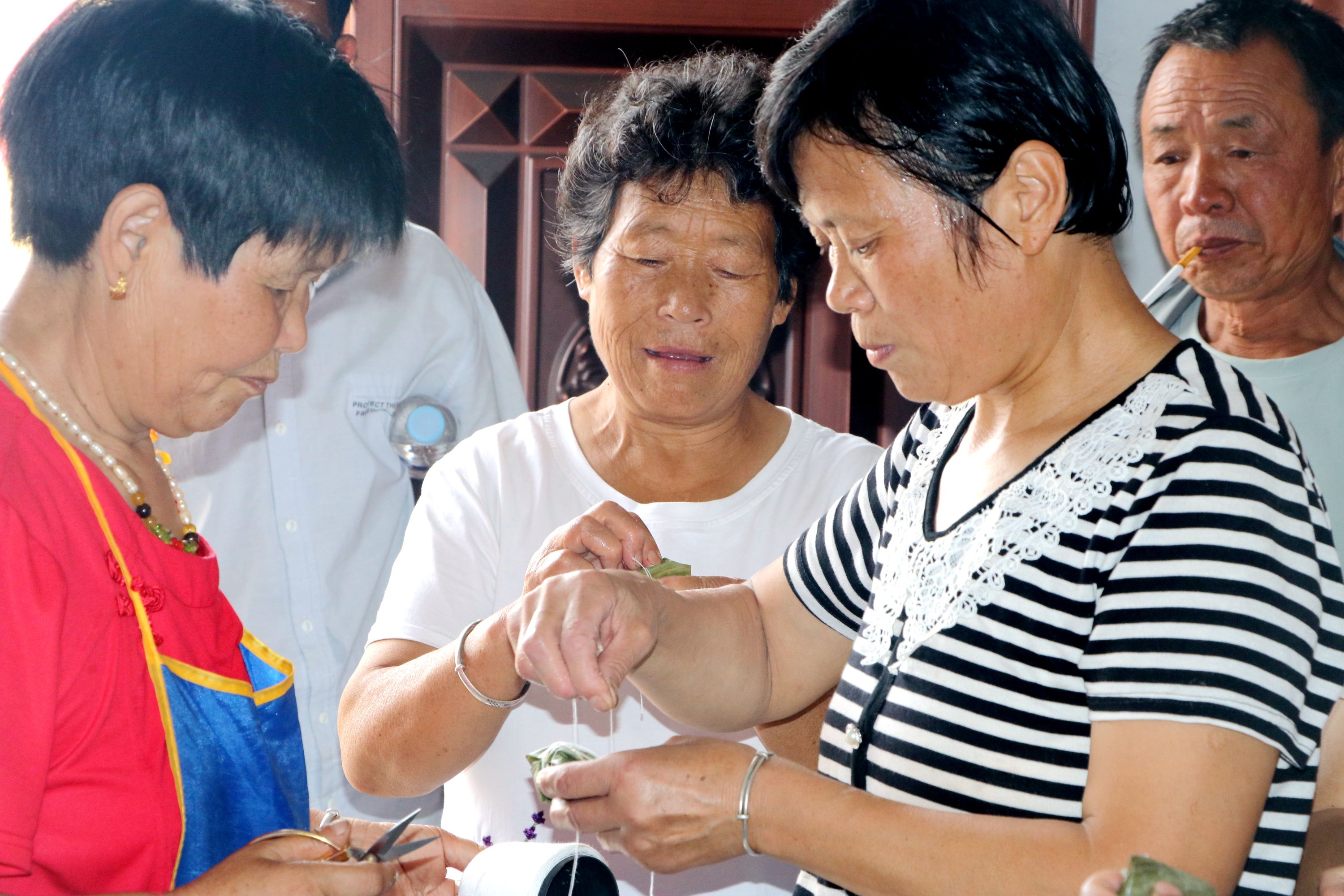 一大早,宋福利就組織村“兩委”成員將泡好的糯米、紅豆、蜜棗、粽葉等材料整齊地?cái)[放在桌子上,做好包粽子準(zhǔn)備工作。活動(dòng)一開始,大家就迅速進(jìn)入包粽子狀態(tài),圍在一起,使出看家本領(lǐng),捋粽葉、做漏斗狀、填糯米、壓緊實(shí)、封口、扎捆……在粽葉翻飛、米香四溢中,翠綠的粽葉和晶瑩的糯米在一雙雙巧手中瞬間變成了一個(gè)個(gè)清香誘人的粽子。大家一邊包粽子,一邊嘮家常,說著、笑著,一片融洽和諧。經(jīng)過1個(gè)多小時(shí)的辛勤勞作,粽子包好了,宋福利和老人們把包好的粽子分成若干份,送給村里行走不便的低保戶、獨(dú)居老人、“五?!崩先?,并與他們進(jìn)行交談,了解他們近期的生活情況,叮囑他們保重身體。