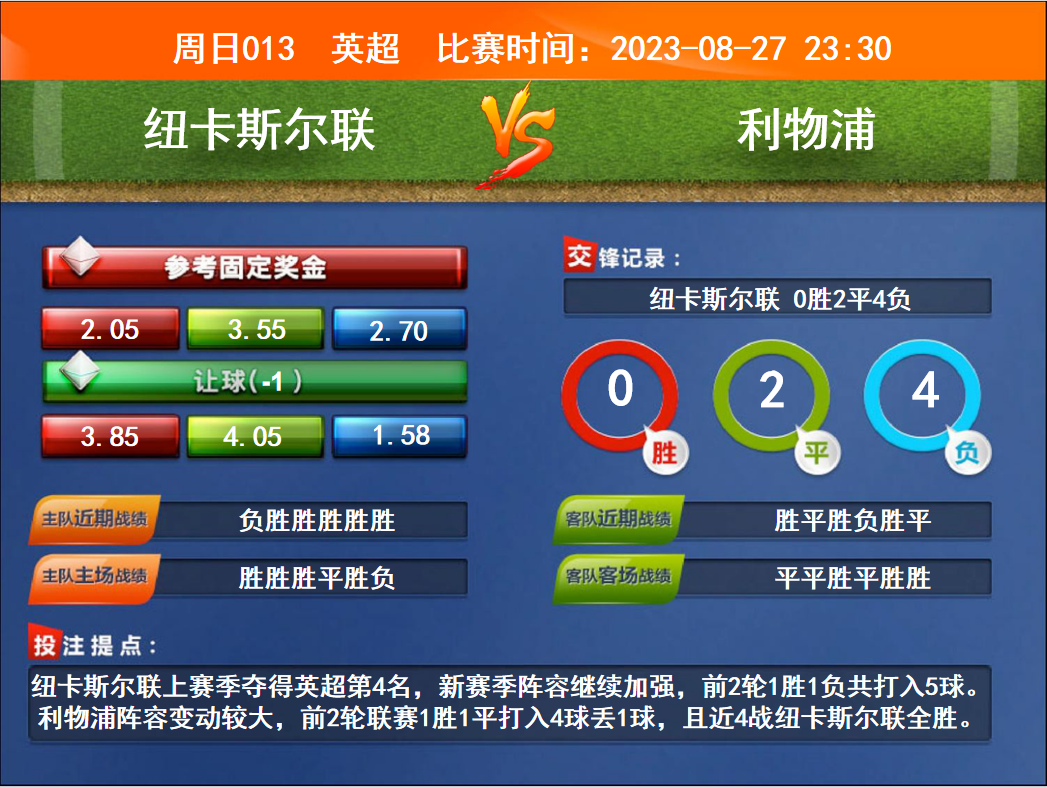 比賽時(shí)間:2023-08-27 23:30賽事提點(diǎn):紐卡斯?fàn)柭?lián)上賽季奪得英超第4名,新賽季陣容繼續(xù)加強(qiáng),前2輪1勝1負(fù)共打入5球。利物浦陣容變動(dòng)較大,前2輪聯(lián)賽1勝1平打入4球丟1球,且近4戰(zhàn)紐卡斯?fàn)柭?lián)全勝。