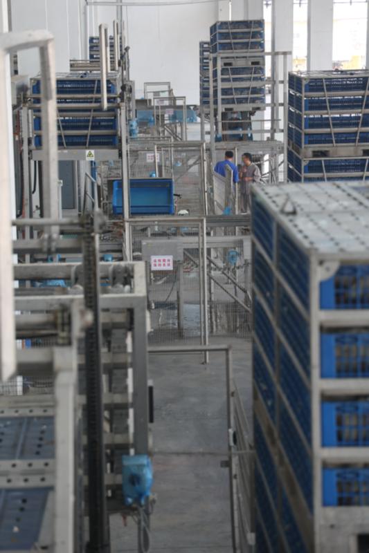 宰雞第一步先消毒,一筐筐自動(dòng)分好的白羽活雞上架后即得到?jīng)_洗,“干干凈凈”地進(jìn)入下一程序——掛雞。步驟與步驟銜接中的自動(dòng)化程度很高,掛雞室光線略暗。“我們采用國際化標(biāo)準(zhǔn),宰殺環(huán)節(jié)在暗室進(jìn)行。”相關(guān)人員說。