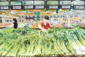 6月9日,一名工作人員正在市區(qū)一超市內擺放蔬菜。當日,國家統(tǒng)計局發(fā)布的數據顯示,2015年5月,全國居民消費價格總水平同比上漲1.2%。(牟宇 攝)